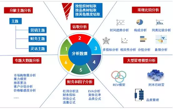 要使各种结构化的、非结构化的、海量的数据实现标准化、信息化,能够提供业务绩效评估、业务决策支持等要求,我们首先需要进行数据分析。这里笔者整理出了一套针对不同数据分析对象所采用的6大类分析方法,每类里面包含各种小方法。常见的六大类分析方法主要包含:主题分析、钻取分析、比较分析、管理模型分析、因子分析、专题大数据分析。