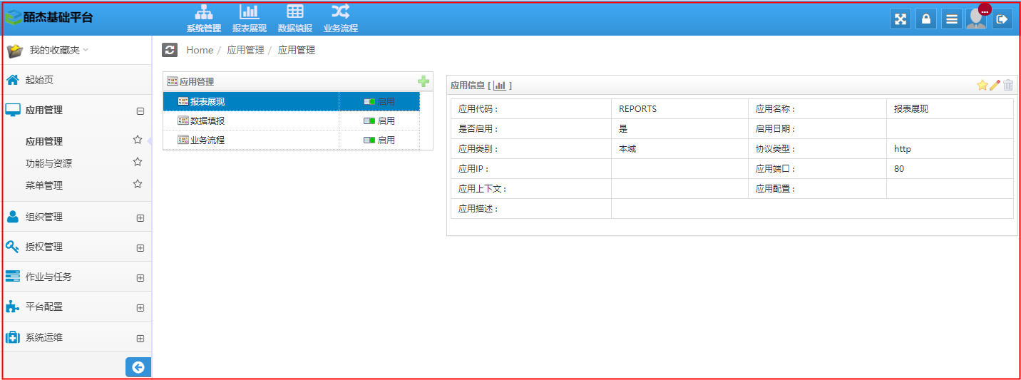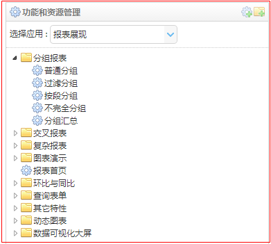 应用管理模块的作用是维护应用及功能集合,部署报表既功能点的管理,以及调整功能菜单结构和顺序。下设应用管理、功能与资源和菜单管理三个分模块,皕杰报表工具设计器设计出来的brt文件就是在功能与资源模块中部署到皕杰基础平台的。可以建立多个应用,每个应用下可以建多个功能集合,每个功能集合下可建多个功能点。