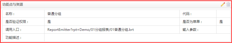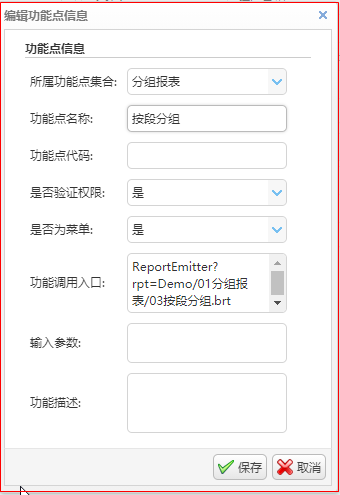 添加功能点中,在功能调用入口处输入调用报表brt的URL地址即完成了一张报表的部署。
