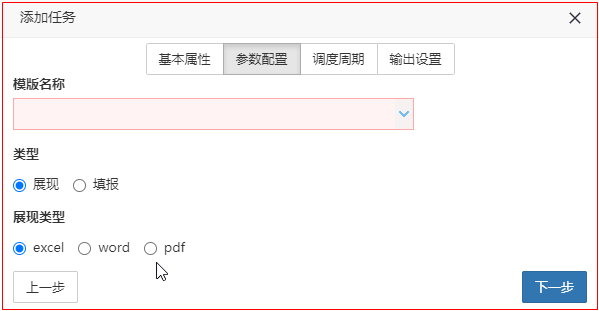 选择模板名称、类型和展现类型后,点击下一步,进入调度周期界面: