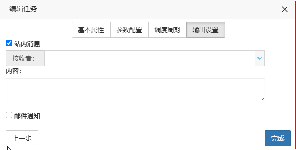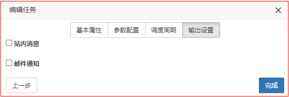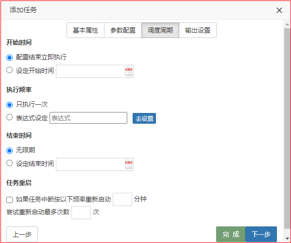 配置开始日期、执行频率、结束时间和任务重启后,可以点击下一步或者点击完成。点击下一步后,进入输出设置界面:
