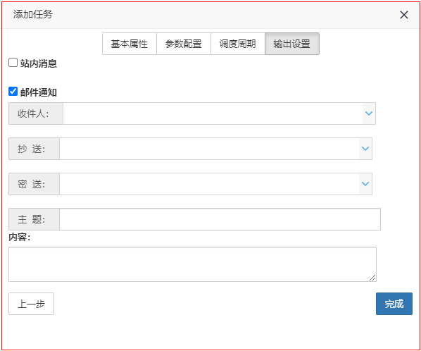 邮件通知:设置收件人、抄送、密送、主题和 内容后,点击完成。