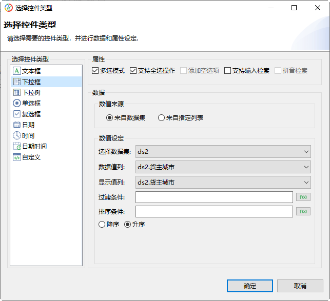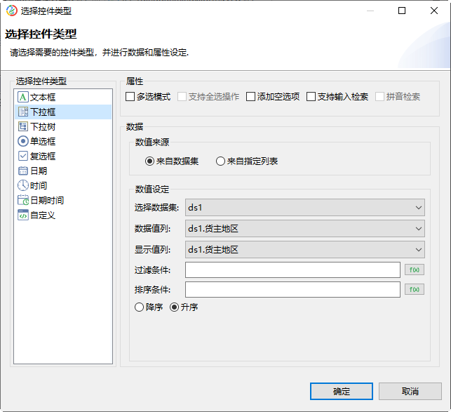 1.地区和城市的控件类型为下拉框,数据为来自数据集