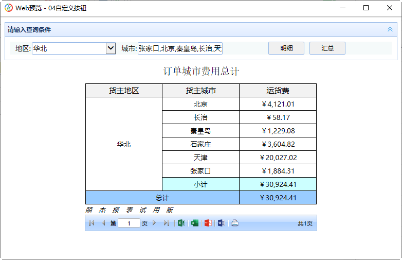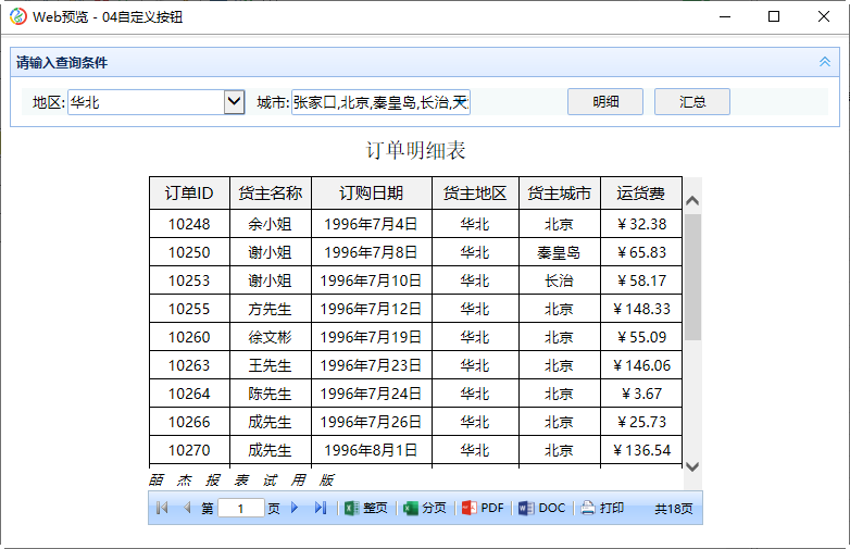 皕杰报表是一款通用的、扩展性好、应用范围广的报表工具产品,因此需要支持灵活的自定义,本篇文章主要介绍皕杰报表演示项目-查询表单-自定义按钮的设计思路。本例中报表示例为04自定义按钮.brt、04-1dingdanmingxi.brt。