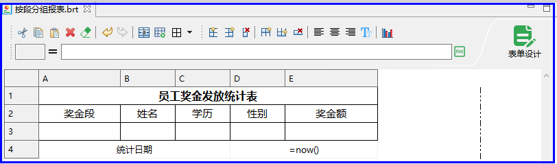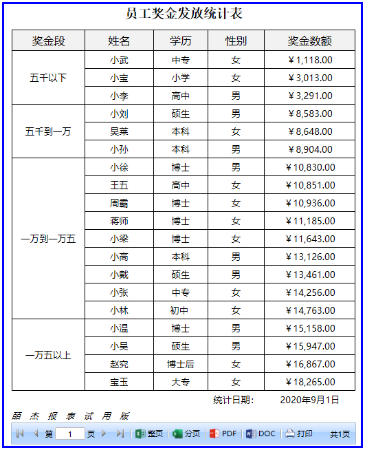 如下图即为一个对奖金的不同数值分段的分组报表。表中将奖金划分了四个数值段,小于五千,五千到一万,一万到一万五,一万五以上。