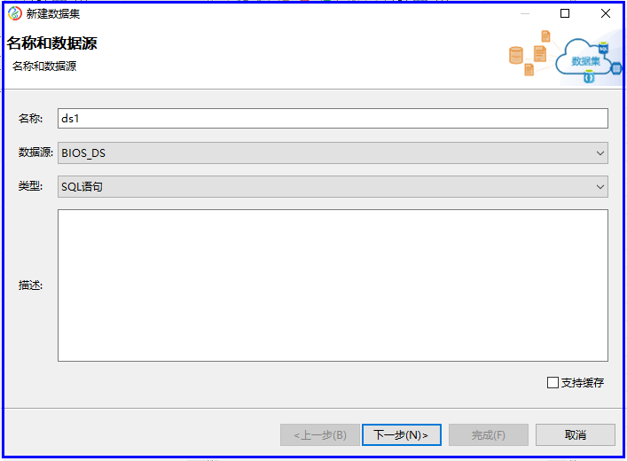 2、在摘要视图里点击新建报表数据集,输入名称“ds1”,选择数据源BIOS_DS,选择类型SQL语句,点击下一步。