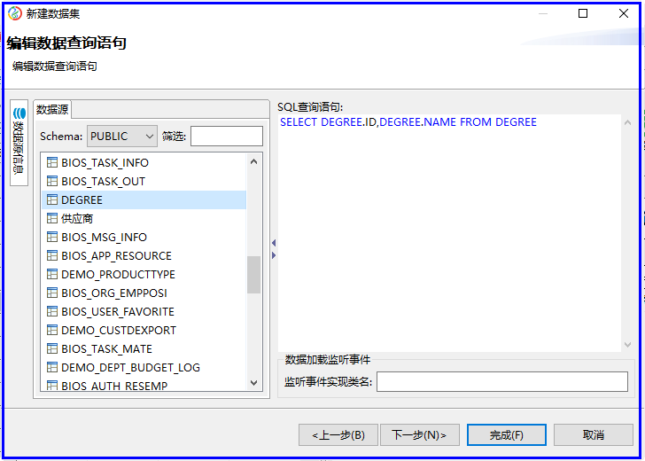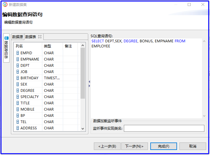 3、在SQL语句对话框里输入SQL语句,SELECT DEPT,SEX, DEGREE, BONUS, EMPNAME FROM EMPLOYEE,点击完成,数据集ds1就建好了。