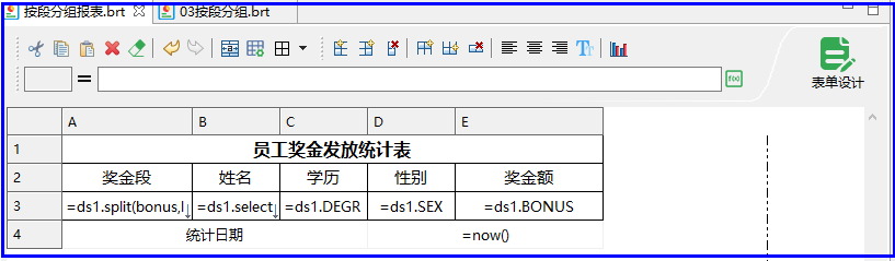 A3单元格数据值:=ds1.split(bonus,list(5000,10000,15000)),显示值:=map(list(0,1,2,3),list('五千以下','五千到一万','一万到一万五','一万五以上')),扩展方向属性选择纵向扩展。