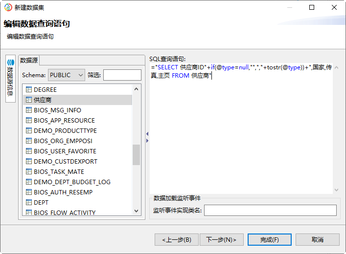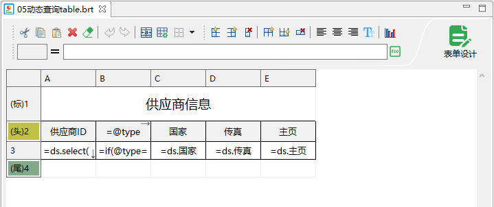 3.新建数据集ds:="SELECT 供应商ID"+if(@type=null,"",","+tostr(@type))+",国家,传真,主页 FROM 供应商"。如图所示