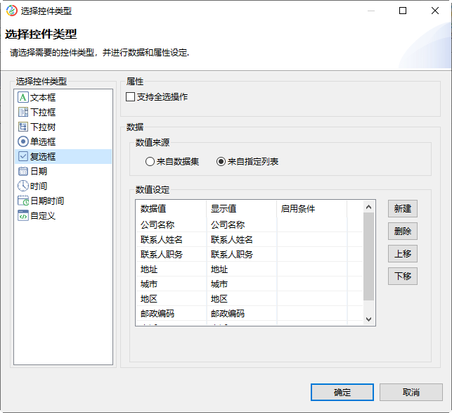 将参数type拖拽到表单设计界面单元格中,控件类型选复选框,数据来源选择来自指定列表,复选框数据值为数据集sql中供应商表中的字段。如下图所示