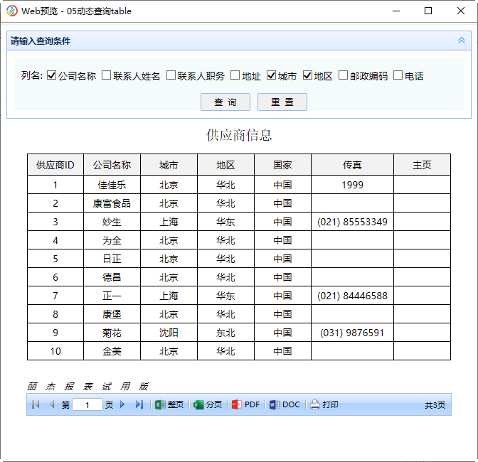 勾选公司名称、城市、地区,点击查询按钮,如下图所示