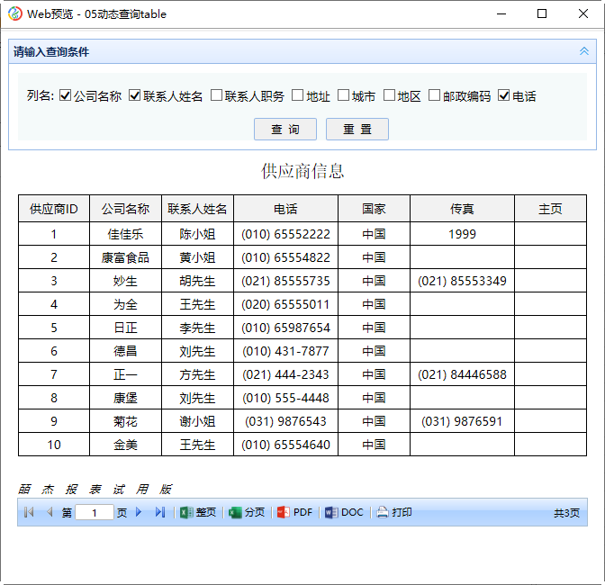 勾选公司名称、联系人姓名、电话,点击查询按钮,如下图所示