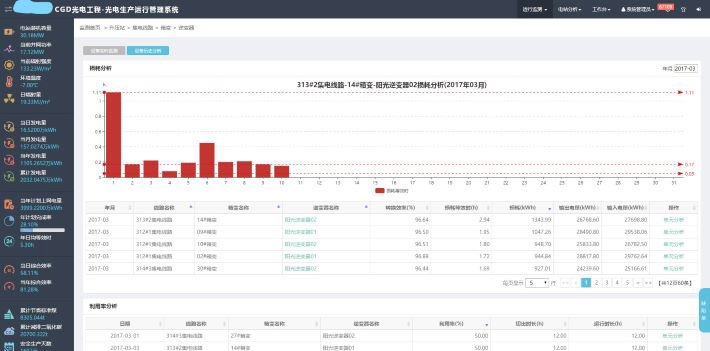 1、发电设备工作状况分析:通过逆变器的历史数据,从损耗等效时、设备利用率、逆变器等效时、设备告警四个方面对逆变器进行全面的分析,定位发电水平较差的逆变器。