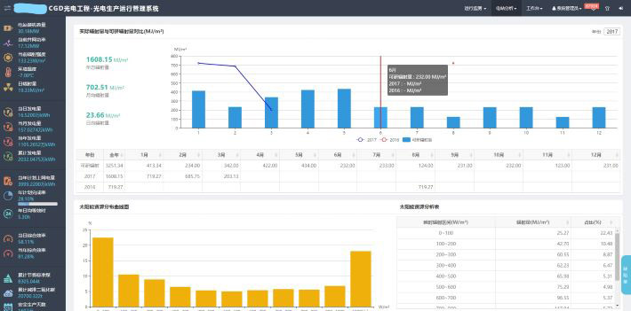 3、太阳能资源分析:电站管理人员可通过对实测辐射量、可研辐射量、资源分布图的综合分析,掌握一个区域的太阳能资源的真实情况。