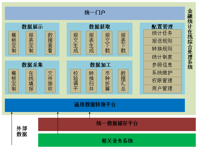 为了使银行更好地应对人民银行、银保监会、外管局的监管制度和行内相关统计报表要求,同时减轻统计人员和科技人员的工作压力,为商业银行量身定作了一套统一监管报送系统,以满足商业银行监管工作的业务需求。用户可以通过报表的形式定义、发布统计项目,采集、加工统计数据,展现、分发统计信息,其中包括:
